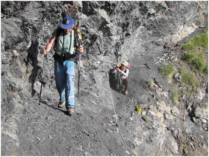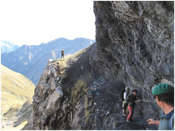 Dans ce long passage, où la vire, soutenue par la falaise de calcaire