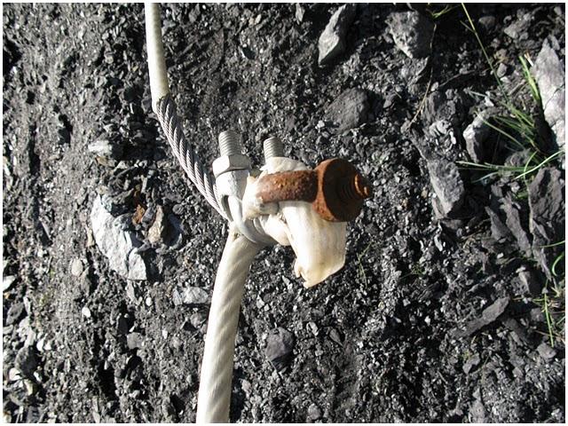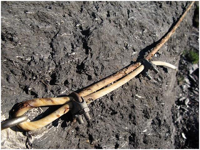 coupées net au ras de la roche suite à de l'oxydation. Le câble est à terre