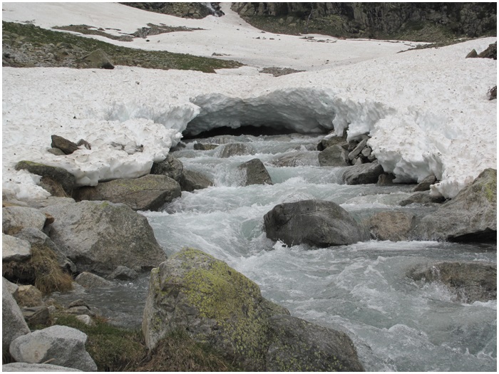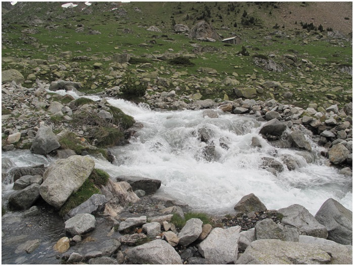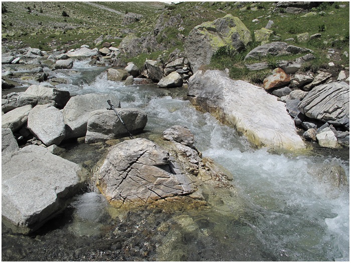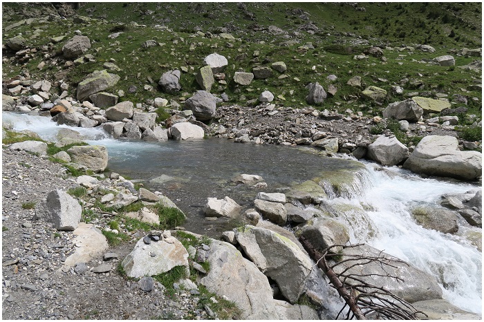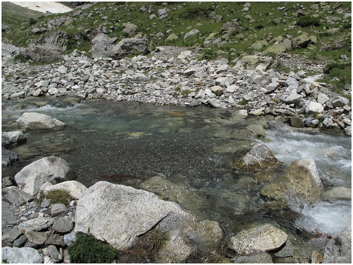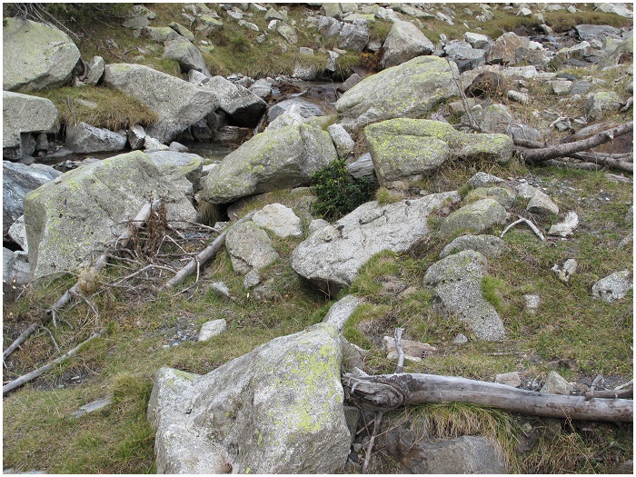 pelouses de la rive gauche du torrent, parsemée de blocs erratiques