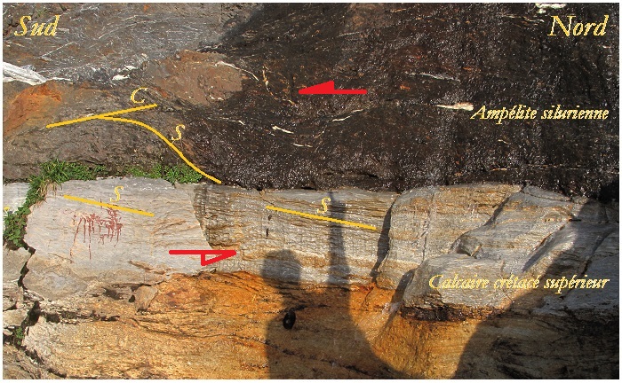 le contact entre l'ampélite en haut et le calcaire crétacé
