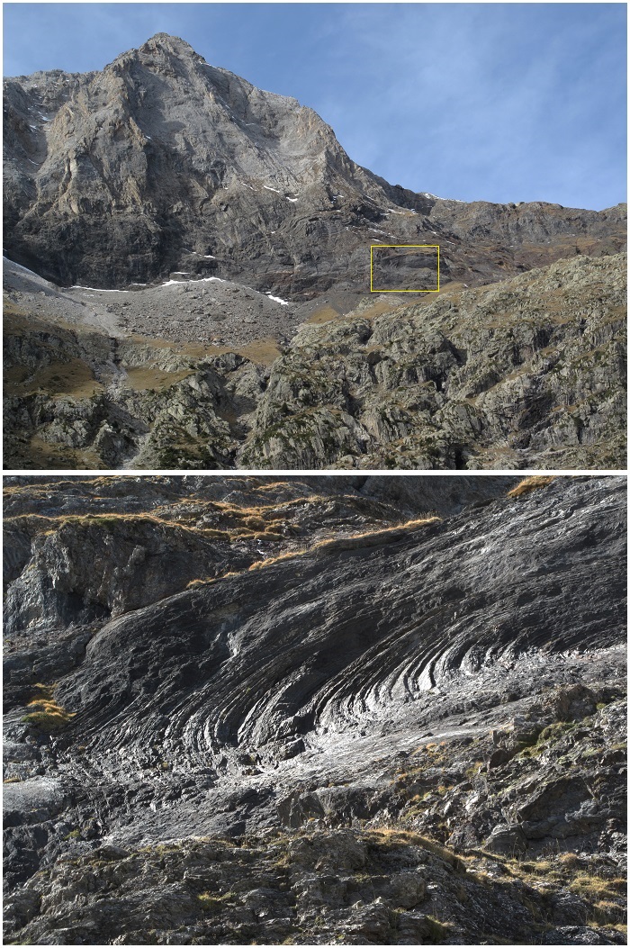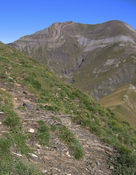 ![]() Dans la face est du pic Gerbats, en haut de la muraille de Barroude, donc à l'intérieur des schistes bruns du Dévonien moyen de la nappe de Gavarnie, ou au contact avec le calcaire, existe, le long d'une faille, un chevauchement, du nord (à droite) vers le sud, avec, le long de cette faille, des plis manifestement liés au frottement qui s'opposent au glissement sur ce plan de charriage (note 4). A noter qu'un chevauchement, par compression, peut se produire à toutes les échelles, de l'échelle métrique à l'échelle kilométrique. |