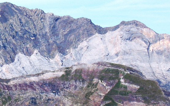 sur les roches du cirque de Barrosa, de part et d'autre du plan de chevauchement
