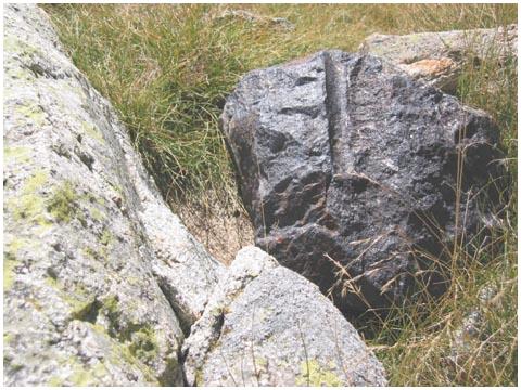 montrant un petit bloc rocheux trouvé sur le chemin du cirque et portant