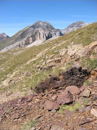 se répandent les déblais (ou "haldes"). Au fond, le massif du Mont-perdu à gauche, les deux bosses du pic Chinipro à droite. |