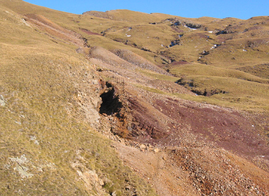 ![]() Autre PHOTO d'une tranchée des mines Robert, sur le plateau de Liena, creusée pour exploiter le filon occupant la faille mettant en contact le granite à gauche et le grès rouge à droite. En haut et à gauche : le col (sans nom) entre le pic Liena à gauche, et le pic La Mota qu'on voit au centre de la photo. |