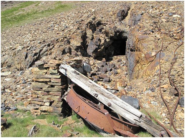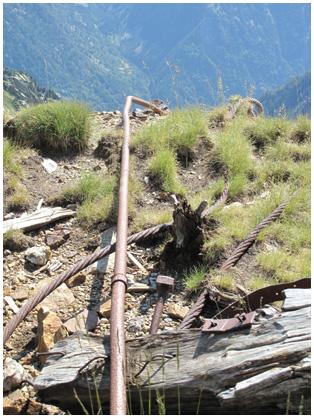 d'une dizaine de mètres, qui affleure dans l'axe du vallon granitique. Ci-contre, devant l'entrée de cette même galerie, un tuyau qui pourrait être celui qui amenait l'air comprimé aux marteaux pneumatiques. |