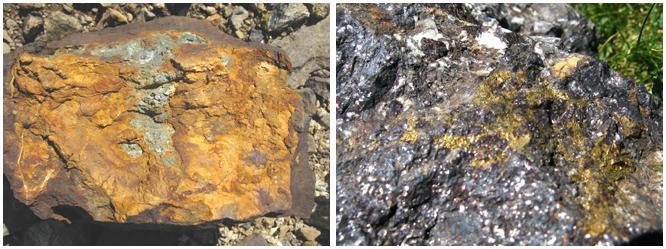 à gauche, pyrite (sulfure de fer, couleur or) sur de