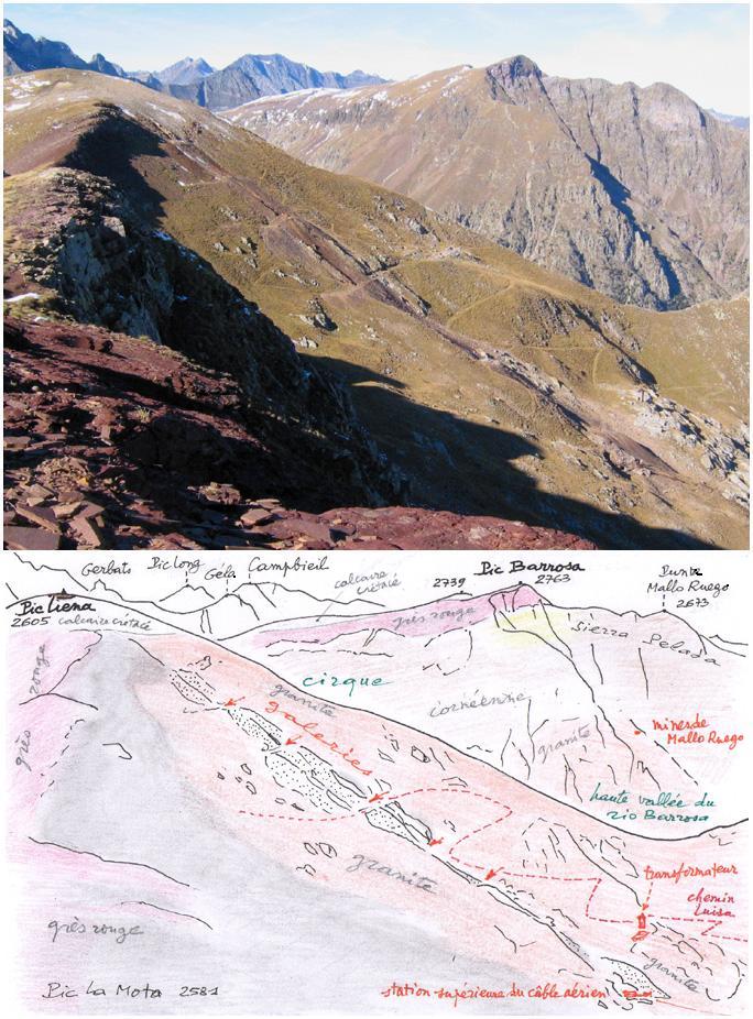 la vallée du rio Barrosa Comme le pic de Liena, le massif des Puntas Suelsa et Fulsa est constitué par, reposant sur un soubassement de granite (c'est toujours le "granite de Bielsa"), une assise de grès rouge épaisse, dans laquelle est taillée la punta Fulsa. Le sommet de la punta Suelsa est coiffé d'une " klippe", reste d'une nappe de charriage détruite par l'érosion. Au fond, à gauche, derrière le paso del Caballos et le pic d'Urdiceto (schisteux), le massif des Posets. A gauche, le pic Mener (également shisteux), où se situent des vestiges d'anciennes mines de fer. |