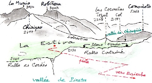 PRATIQUES : - Accès : sortie 16 de l'autoroute A64, St-Lary, tunnel d'Aragnouet-Bielsa, route A-138, village de Bielsa, vallée de Pineta jusqu'au parking, à 13 km de Bielsa, 84 de l'autoroute, 204 km de Toulouse ; - Hébergement : * refuge de Pineta, dans la vallée de Pineta, à 2 km du parking (tel. 974 50 12 03 ; de la France 00 34 974 50 12 03 ; réservation par internet possible) ; * ou bien la cabane (ou " refuge ") de La Larri, un peu au-dessus du débouché de la piste sur le pla de La Larri (1550 m.,270 m au-dessus de la vallée de Pineta); rudimentaire : grande mais dépourvue de tout mobilier, sol en ciment et dalles, petite cheminée (tire-t-elle : ?) ; - Dénivelé : 1100 m (780 m à partir de la cabane de La Larri) ; - Horaires : :environ 4 h ; aller et retour : 7 h ; on peut faire la course dans la journée, ou coucher dans la cabane ; - Cartes : au 1/25000 : * édition Prames, Parque Nacional de Ordesa y Monte Perdido, II Anisclo-Pineta - * édition Alpina, Parque Nacional de Ordesa y Monte Perdido, Sector Pineta-Escuain-Anisclo-Barroude. |