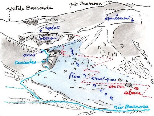 Barrosa, il y a, peut-être, 10000 et 15000 ans.environ Elle est parsemée de blocs erratiques de calcaire (alors qu'on est là dans le domaine du granite), dont on peut penser qu'ils proviennent de la couche de calcaire dévonien de la falaise nord du cirque (celle-ci constituant le cirque glaciaire creusée par ce glacier), en sachant que ce calcaire peut se débiter en gros blocs, comme au pied de la muraille de Barroude. La cabane de Barrosa s'abrite au-dessous de l'un de ces blocs. Entre ce cirque et la moraine se situe le verrou glaciaire supportant l'ombilic lacustre (replat herbeux et son laquet). |