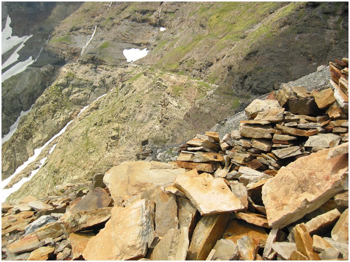 la roche sombre (ampélites, en haut) et la roche claire (cornéenne,