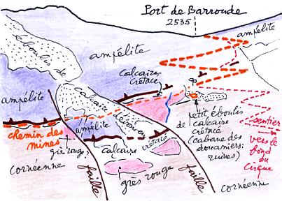 PHOTO (ci-dessus, avec calque explicatif ci-contre) situant le chemin des mines, entre la falaise nord du cirque (à gauche) et le port de Barroude (en haut et à droite), et la "cabane des douaniers", dans un petit éboulis de dalles de calcaire crétacé. On y voit le filet d'eau, proche de la cabane des douaniers, dont parle Lucien Briet dans son récit ("l'eau coulait à deux pas" ; Voir une photo ci-dessous, et la note 2). |