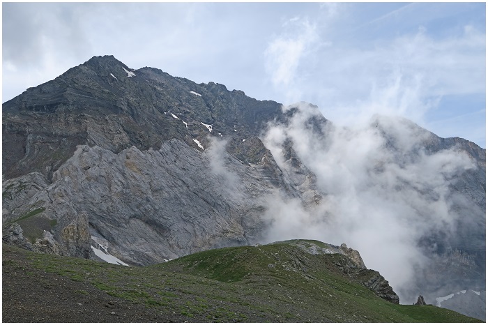 un nuage, empanachée par un autre, la dent du pic Gerbats. Le sommet