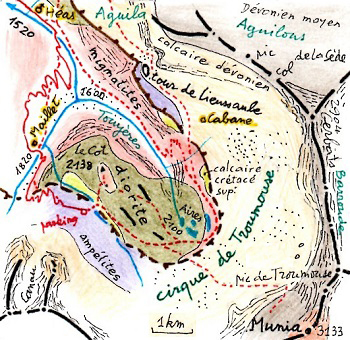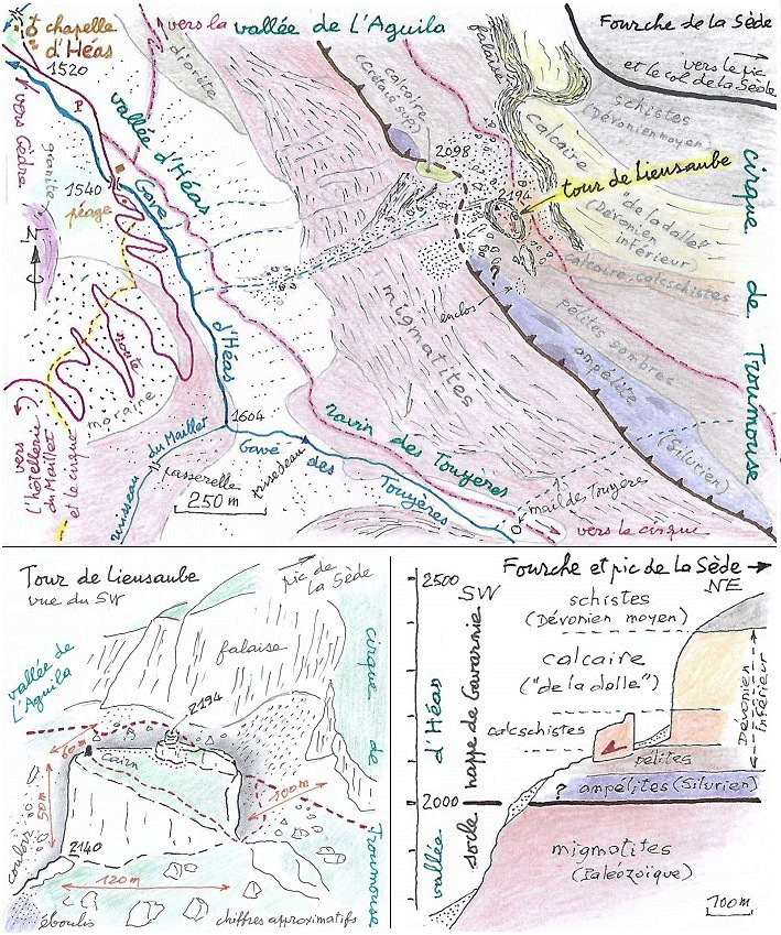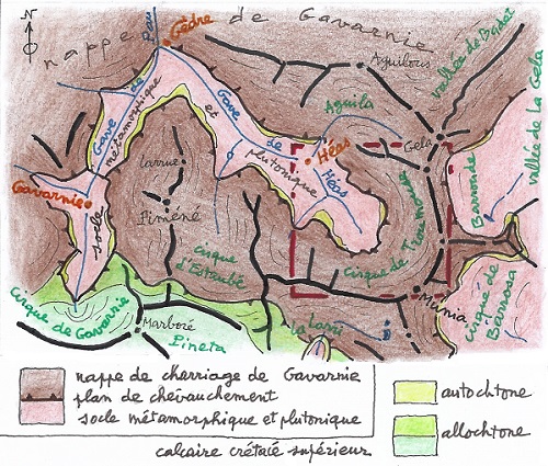 C'est la carte de la "fenêtre" Gavarnie-Héas créée dans la nappe de charriage de Gavarnie par le creusement, par érosion glaciaire, des vallées des gaves de Pau et de Héas. Dans ces vallées elle découvre le socle métamorphique et plutonique sous-jacent. L'extrémité est de cette "fenêtre" (cadre rouge), en amont d'Héas, se situe dans le cirque de Troumouse. Plus à l'est l'érosion glaciaire a creusé les cirques de Barroude et de Barrosa |