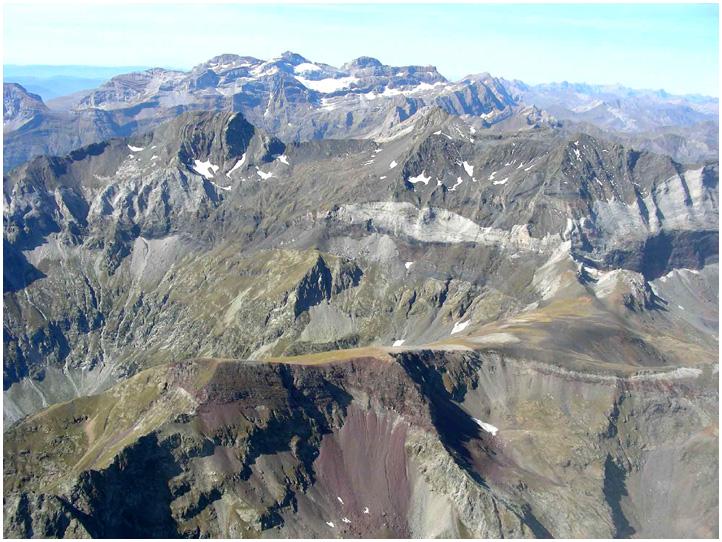 Barrosa, au deuxième plan. Au fond : le massif du Mont-Perdu. On voit surtout son versant nord-est, qui domine la vallée du rio Pinara Le calque explicatif (ci-contre) détaille la topographie et la géologie du pic et du cirque (le tireté orange situe le chemin des mines et le trait gras marron le plan de chevauchement). |