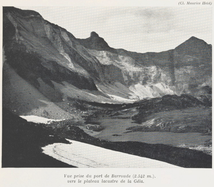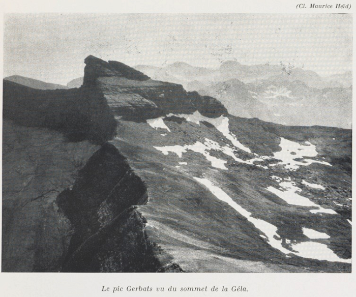 de La Gela et le cirque de Troumouse. C'est ce qu'ont fait les frères Jean et Pierre Ravier et leurs compagnons de cordée, en 1952 par la face est, première des voies qu'ils ont ouvertes dans la muraille de Barroude, puis en 1970 par la face est directe. Mais ce versant est n'est pas accessible au simple randonneur. En revanche il peut monter au pic Gerbats par son versant opposé, celui du cirque de Troumouse, en empruntant la voie normale, peu difficile quoique obligeant à franchir le célèbre "mauvais pas du Gerbats" (note 4) et comportant un peu d'escalade facile dans sa partie terminale. |