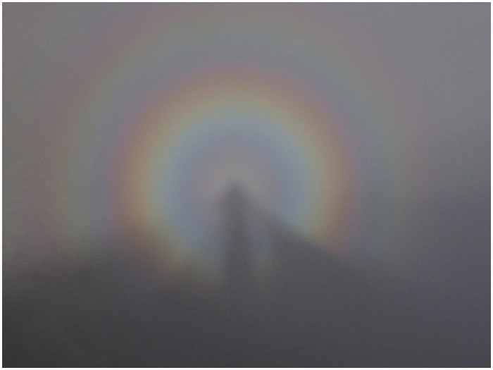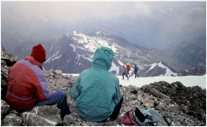 au sommet du pic. A l'arrière-plan, à gauche, la brume