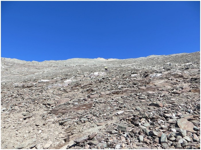 par une courte pente raide, le collet qui rattache le rognon rocheux coiffant
