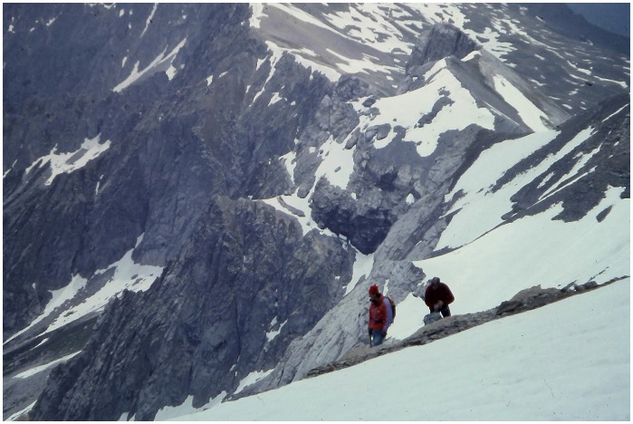 dans une pente neigeuse sous l'arête sommitale du pic Robiñera,