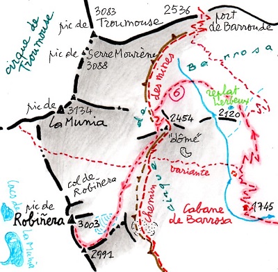 en novembre des abords du pic Barrosa. En tirets rouges sur le calque, les différents itinéraires permettant de gravir facilement le pic Robiñera et le pic de La Munia depuis le fond du cirque. Par dessus le col de Robiñera, on aperçoit