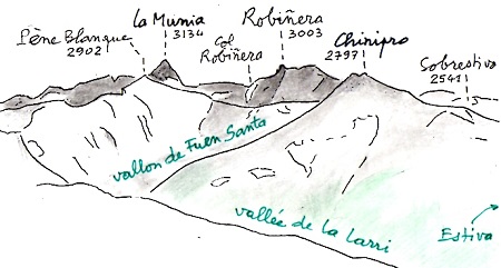 par l'ouest le pic Chinipro, débouche dans le pla de La Larri, vallée