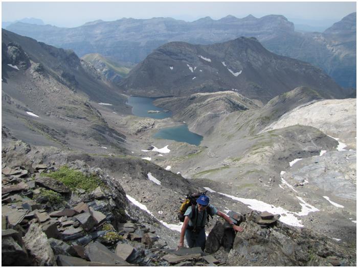 son arête sud-ouest. A gauche : la Pène Blanque qui porte bien son nom (calcaire dévonien). Entre Chinipro et Pène Blanque : le vallon de Fuen Santa, partie haute de la vallée de La Larri, au débouché des lacs de La Munia (qu'on ne voit pas). A l'arrière-plan : deux sommets de plus de 3000 m., la Munia à gauche, le Robiñera à droite, séparés par le large col Robiñera. |