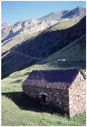 granitique chevauché par la nappe de charriage de Gavarnie. Au fond : la barre taillée dans le calcaire dévonien clair de la nappe de charriage ; elle en forme le bord qui domine le plateau de Liena, en haut à droite. Au niveau de cette grange a été aménagée dans le passé une esplanade en vue, semble-t-il, de l'installation, dans la vallée et sur le plateau de Liena, d'une station de ski : projet en panne ou, espérons-le, abandonné parce qu'il aurait pu défigurer cette belle vallée. La photo a été prise avant cet aménagement. |