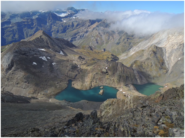 le col de La Munia, vue sur les lacs de La Munia et le pic Chinipro.