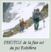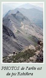 A l'est du pic de Robiñera pointe un rognon rocheux (une antécime, surmontant une grande face de calcaire dévonien clair). Il est séparé du versant est du pic par un collet, au-dessus d'un vallon neigeux, bien visible du"dôme" : c'est par ce collet que passe l'itinéraire : voir la page de PHOTOS de la face est (vignette ci-dessous) où figure une photo avec calque explicatif indiquant l'itinéraire. Celui-ci est également parfaitement visible dans un vaste panorama pris du sommet de La Munia, signé Olivier Guix, pour lequel vous trouverez un lien dans la page La Munia.