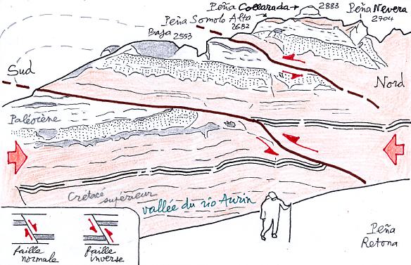Gallego), juste à l'est de la Peña Collarada. On y voit deux failles inverses (voir le petit schéma dans le coin inférieur gauche du schéma interprétatif) qui sont des plans de chevauchement liés au fait que ce massif calcaire (fin du Crétacé à la base, surmonté du calcaire compact du Paléocène dans lequel sont taillées des falaises) a subi, lors de la surrection des Pyrénées, une compression dans la direction nord-sud qui a fait se chevaucher trois nappes de charriage (flèches rouges). Au front d'un chevauchement un pli se combine avec la faille par laquelle ce chevauchement glisse sur son substratum : on parle de "pli-faille". Mais il arrive que la partie "pli" ait disparu du fait de l'érosion, et on ne voit que la faille. |