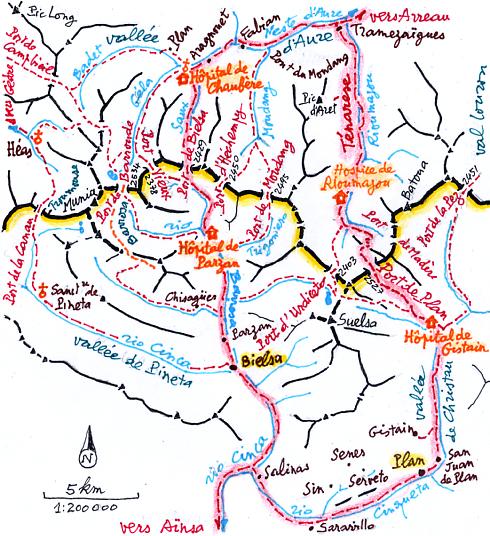 CARTE des ports et des chemins entre les vallées d'Aure et du rio Cinca avant la construction des routes, localisant les hospices ou hôpitaux >