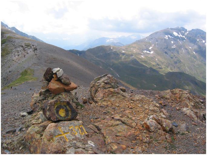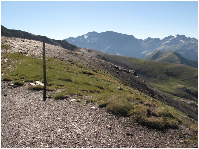 des éboulis, porte la pancarte marquant le port(2527 m.), un peu au-dessus