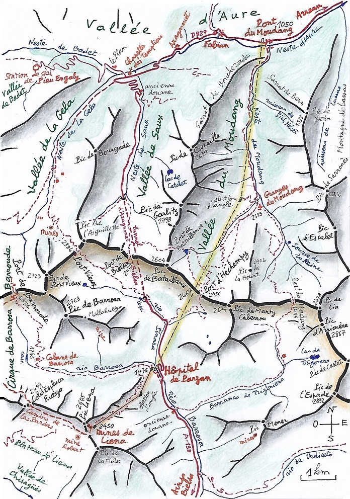 d'Aure, au pont du Moudang (1050 m.), franchissant la crête frontière