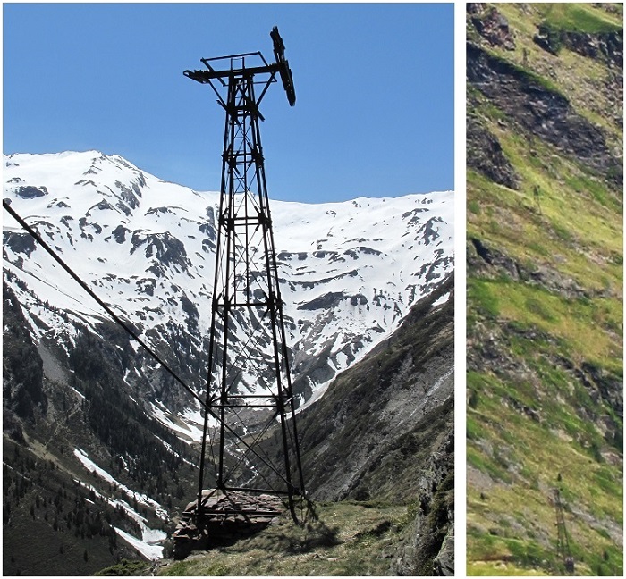 pylônes debout, dont celui-ci, au bord du sentier qui monte des granges
