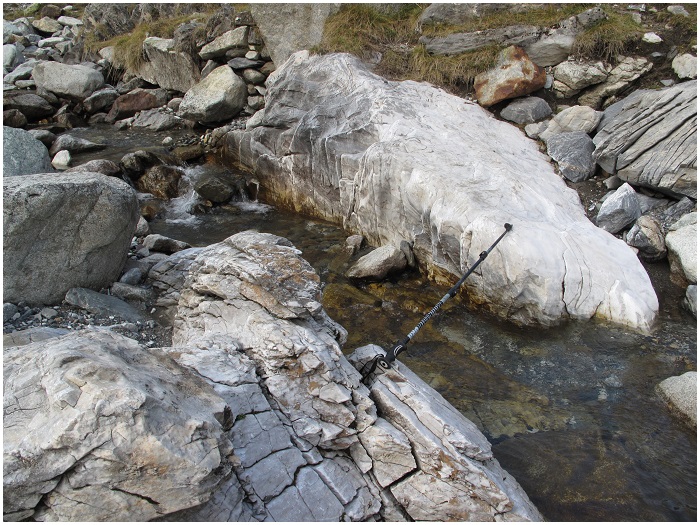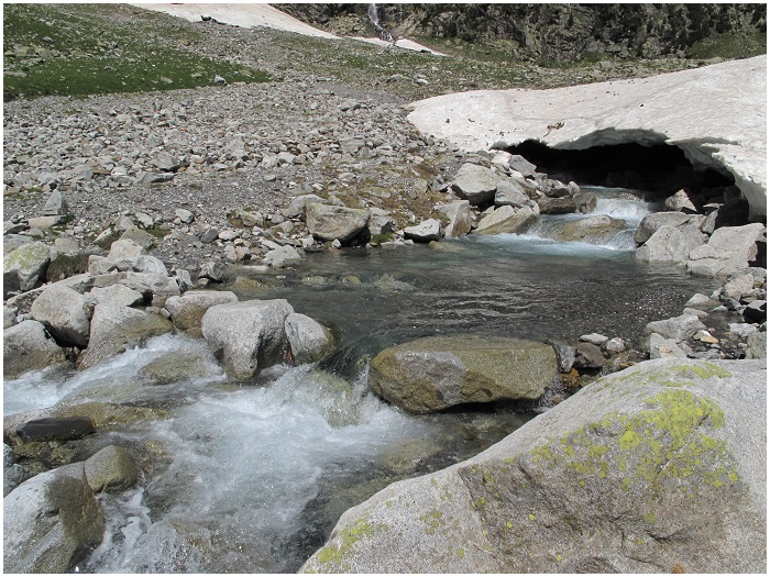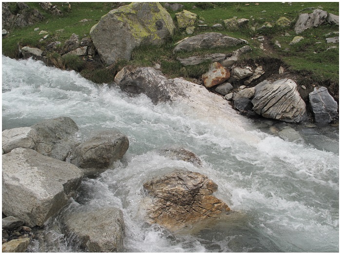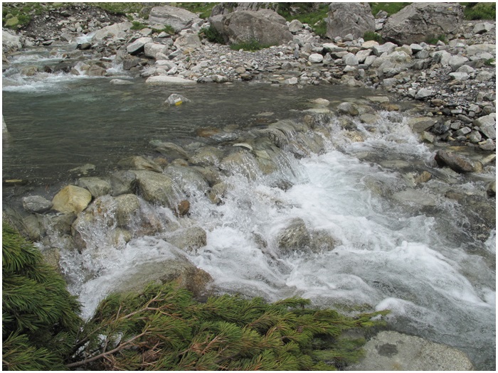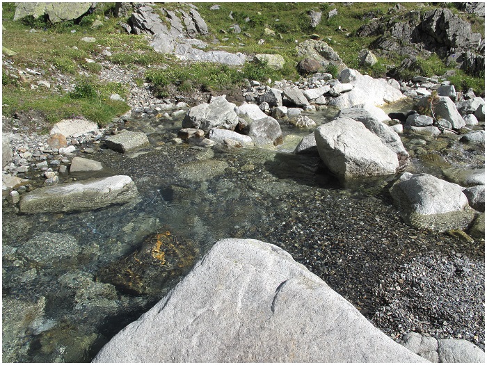 pelouses de la rive gauche du torrent, parsemée de blocs erratiques