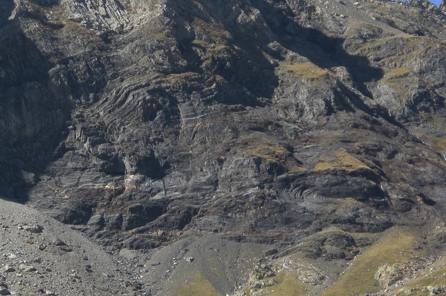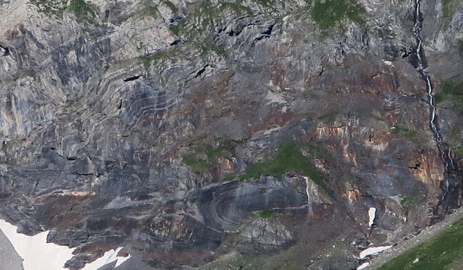![]() Dans la face est du pic Gerbats, en haut de la muraille de Barroude, donc à l'intérieur des schistes bruns du Dévonien moyen de la nappe de Gavarnie, ou au contact avec le calcaire, existe, le long d'une faille, un chevauchement, du nord (à droite) vers le sud, avec, le long de cette faille, des plis manifestement liés au frottement qui s'opposent au glissement sur ce plan de charriage (note 4). A noter qu'un chevauchement, par compression, peut se produire à toutes les échelles, de l'échelle métrique à l'échelle kilométrique. |