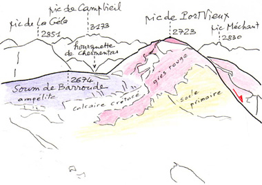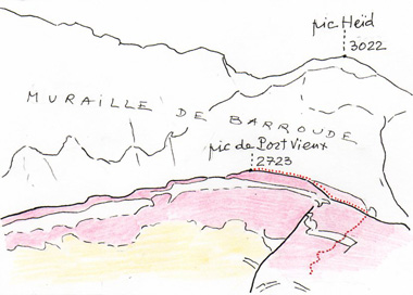< CARTE GEOLOGIQUE schématique (un peu simplifiée) de la région Port de Barroude-Pic de Barrosa-Pic de Port Vieux, précisant la topographie du lambeau de poussée (traits obliques).