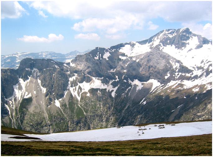 Au premier plan, des moutons sur un névé.