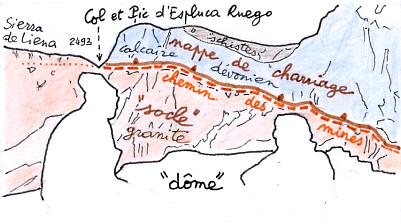 La corniche est soulignée par la neige. Le CALQUE explicatif ci-contre, explique la structure en deux étages de la falaise sud du cirque : nappe de charriage en haut, constituée surtout de calcaire dévonien , soubassement (ou "socle"), en bas, constitué de granite, le chemin des mines courant sur la corniche enneigée, à la limite des deux étages, donc à hauteur de la surface de chevauchement, de plain-pied avec la surface du plateau de Liena, débarassé, lui, par l'érosion, de la nappe de charriage. |