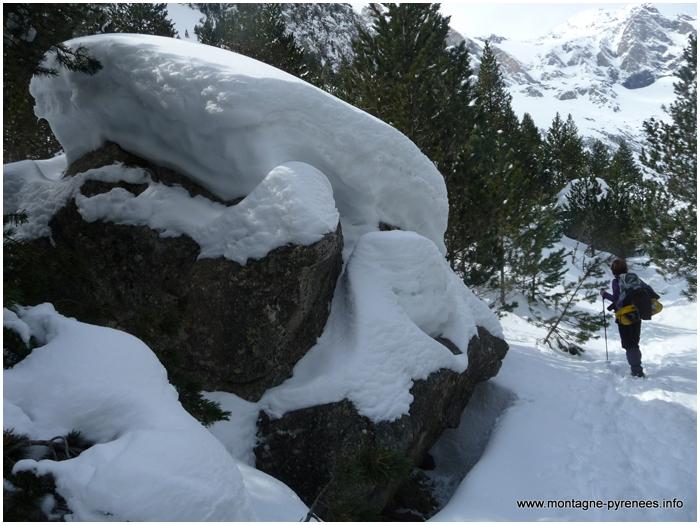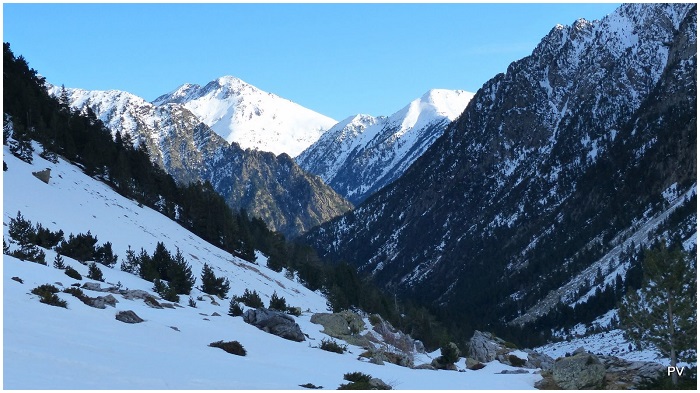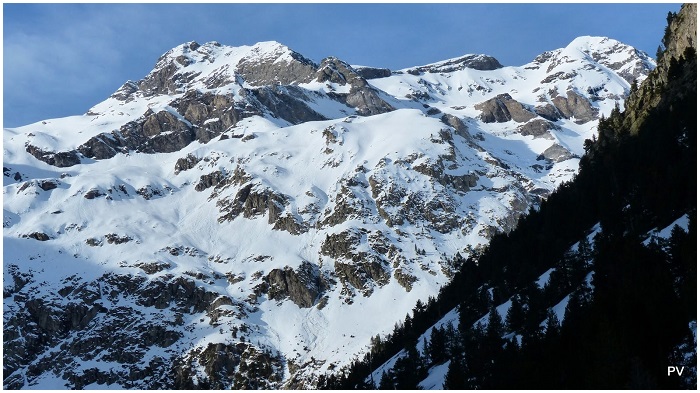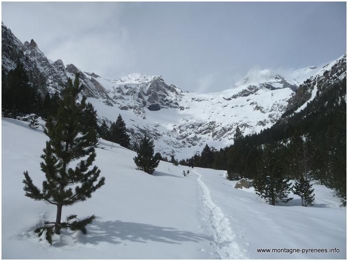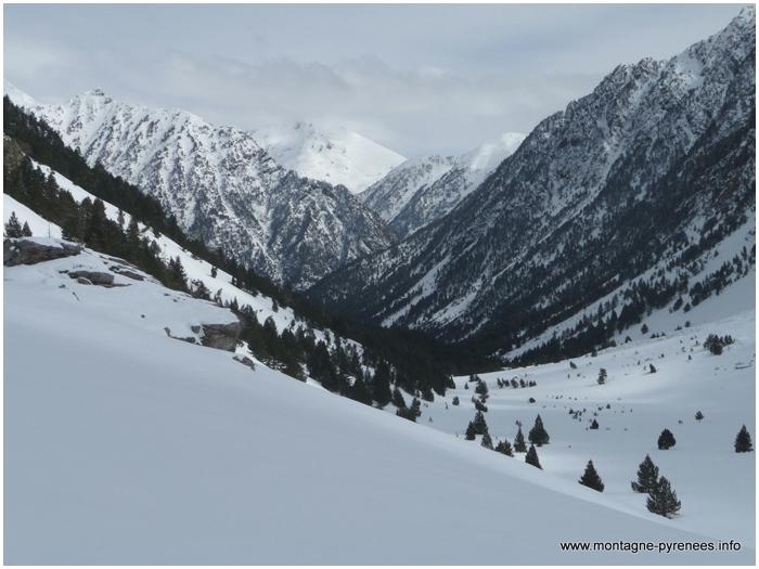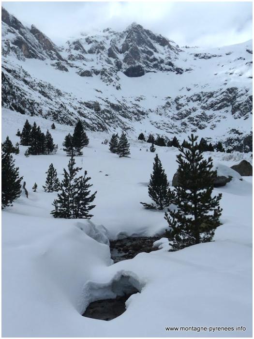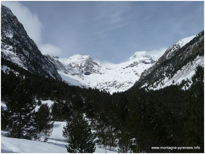 le sommet enneigé du pic de Troumouse. A droite : le port