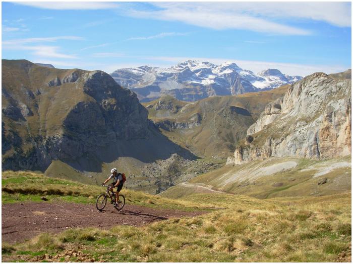par la piste). En toile de fond : le massif du Mont-Perdu dont on distingue,