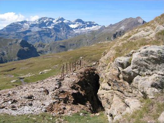 se répandent les déblais (ou "haldes"). Au fond, le massif du Mont-perdu à gauche, les deux bosses du pic Chinipro à droite. |
