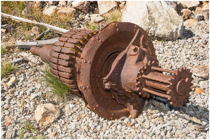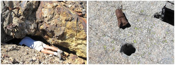 d'une dizaine de mètres, qui affleure dans l'axe du vallon granitique. Ci-contre, devant l'entrée de cette même galerie, un tuyau qui pourrait être celui qui amenait l'air comprimé aux marteaux pneumatiques. |