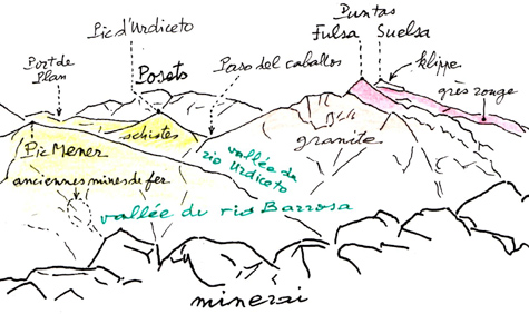 la vallée du rio Barrosa Comme le pic de Liena, le massif des Puntas Suelsa et Fulsa est constitué par, reposant sur un soubassement de granite (c'est toujours le "granite de Bielsa"), une assise de grès rouge épaisse, dans laquelle est taillée la punta Fulsa. Le sommet de la punta Suelsa est coiffé d'une " klippe", reste d'une nappe de charriage détruite par l'érosion. Au fond, à gauche, derrière le paso del Caballos et le pic d'Urdiceto (schisteux), le massif des Posets. A gauche, le pic Mener (également shisteux), où se situent des vestiges d'anciennes mines de fer. |