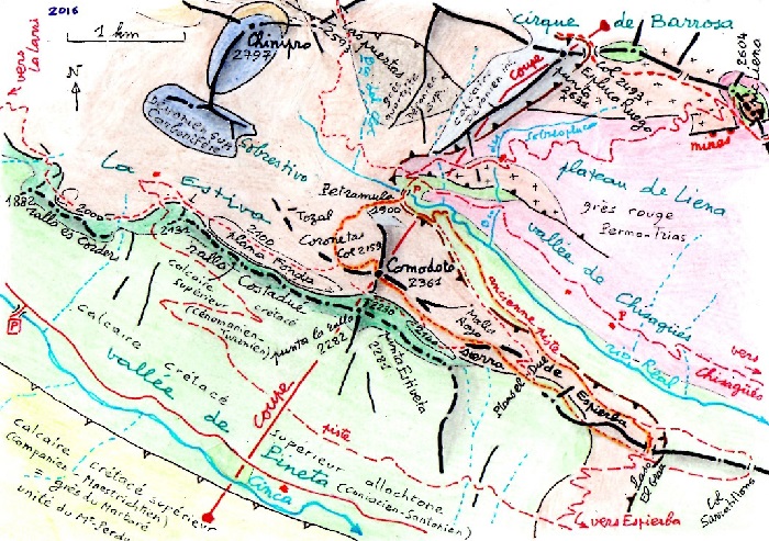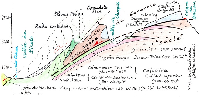 1. Le lendemain d'une ascension de La Munia, Franz Schrader se trouve, le 11 août 1877 (la veille de sa découverte du cirque de Barrosa), dans la région du pic Comodoto. Descendant de la sierra de Espierba sur le village de ce nom il trouve, "accident bien imprévu, un caillou de granit sur le chemin ; bientôt un second, puis un troisième, puis des blocs, partout, arrondis, une véritable moraine latérale de granit (1600 m.) sur une chaîne absolument calcaire. Si je n'étais pas en Espagne, sachant d'après la carte française d'Elie de Beaumont et de Dufrénoy qu'il y a du granit à Bielsa, j'accuserais les cantonniers d'avoir apporté des pierres pour réparer le chemin ; mais le cantonnier d'Espierbe, si tant est qu'il existe, ne doit pas même être soupçonnné ; si les granits sont là, c'est qu'il y sont venus tout seuls, et pour la première fois je m'applaudis de voyager dans une région où les agents-voyers s'appellent torrents, glaciers ou avalanches." Il était loin de se douter qu'il était là sur le front de la nappe de charriage de Gavarnie (mise en évidence au début du XXe siècle).