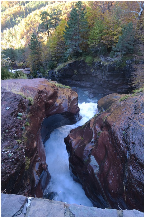 sur des roches rouges dans la forêt de la vallée de Pineta ;