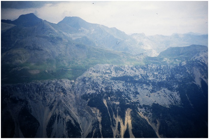 vers le sud sur le pic Comodoto, dont la falaise domine le replat (vert)