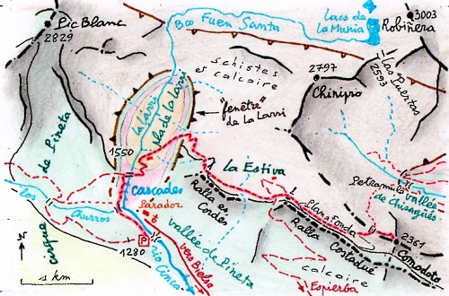 PRATIQUES : - Accès : sortie 16 de l'autoroute A64, St-Lary, tunnel d'Aragnouet-Bielsa, route A-138, village de Bielsa, vallée de Pineta jusqu'au parking, à 13 km de Bielsa, 84 de l'autoroute, 204 km de Toulouse ; - Hébergement : * refuge de Pineta, dans la vallée de Pineta, à 2 km du parking (tel. 974 50 12 03 ; de la France 00 34 974 50 12 03 ; réservation par internet possible) ; * ou bien la cabane (ou " refuge ") de La Larri, un peu au-dessus du débouché de la piste sur le pla de La Larri (1550 m.,270 m au-dessus de la vallée de Pineta); rudimentaire : grande mais dépourvue de tout mobilier, sol en ciment et dalles, petite cheminée (tire-t-elle : ?) ; - Dénivelé : 1100 m (780 m à partir de la cabane de La Larri) ; - Horaires : :environ 4 h ; aller et retour : 7 h ; on peut faire la course dans la journée, ou coucher dans la cabane ; - Cartes : au 1/25000 : * édition Prames, Parque Nacional de Ordesa y Monte Perdido, II Anisclo-Pineta - * édition Alpina, Parque Nacional de Ordesa y Monte Perdido, Sector Pineta-Escuain-Anisclo-Barroude. |