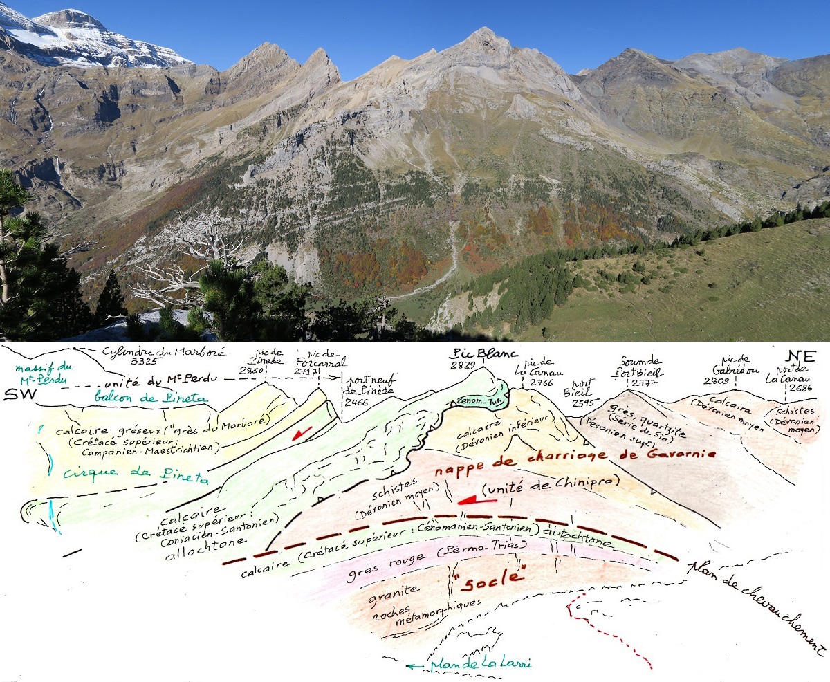 par l'érosion dans la nappe de charriage de Gavarnie, laissant voir