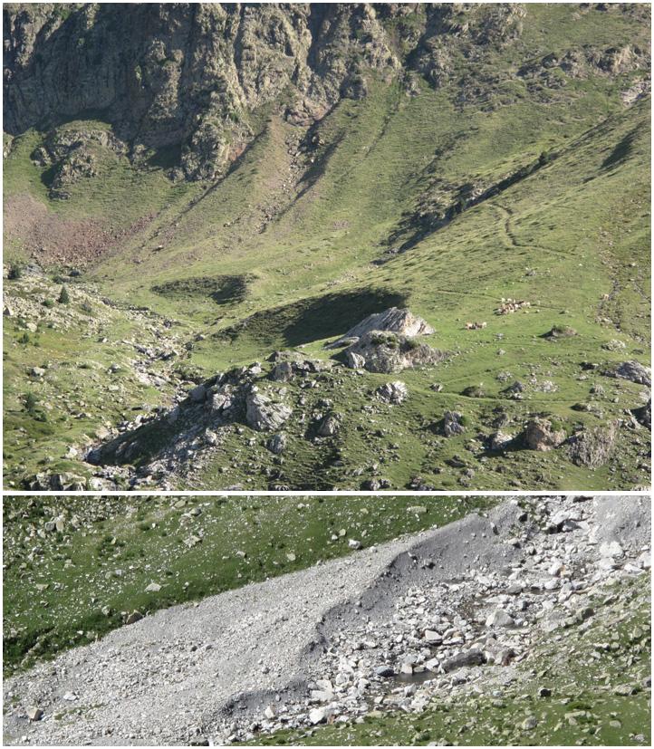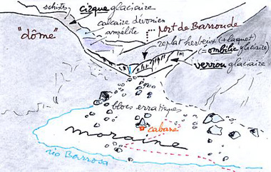Barrosa, il y a, peut-être, 10000 et 15000 ans.environ Elle est parsemée de blocs erratiques de calcaire (alors qu'on est là dans le domaine du granite), dont on peut penser qu'ils proviennent de la couche de calcaire dévonien de la falaise nord du cirque (celle-ci constituant le cirque glaciaire creusée par ce glacier), en sachant que ce calcaire peut se débiter en gros blocs, comme au pied de la muraille de Barroude. La cabane de Barrosa s'abrite au-dessous de l'un de ces blocs. Entre ce cirque et la moraine se situe le verrou glaciaire supportant l'ombilic lacustre (replat herbeux et son laquet). |